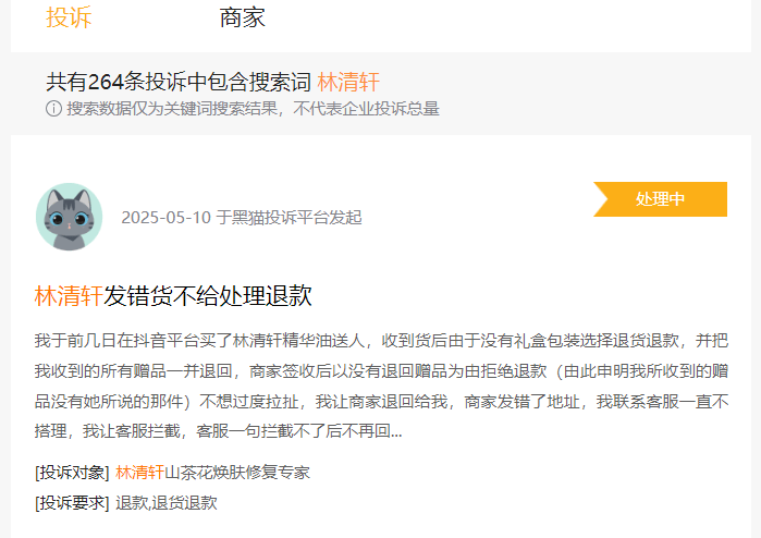 當然了,作為護膚品牌依然逃不掉一個問題,被投訴。2025年2月因宣傳“抗老”功效被罰2.1萬元,暴露宣傳監管漏洞。在黑貓投訴平台,投訴超100條,涉及“過敏”“退貨難”等問題,影響口碑。