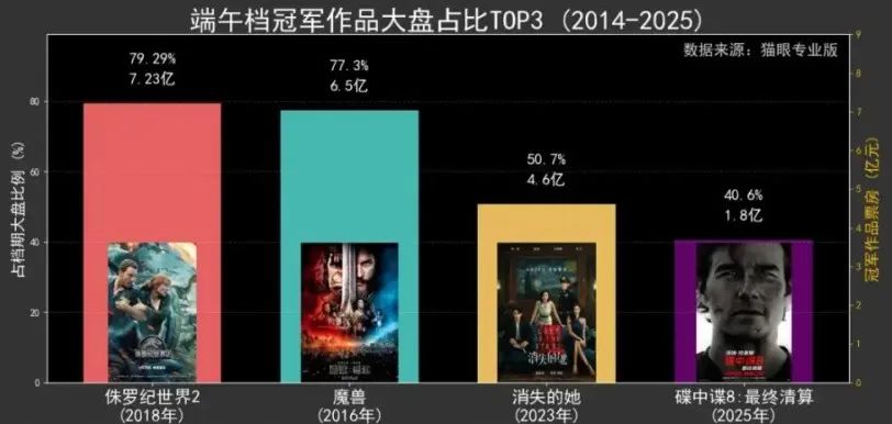 當然,《碟中諜8》對比歷史前三的成績依然近乎腰斬(2016年端午節上映《魔獸》、2018年端午節上映《侏羅紀世界2》和2023年端午節上映《消失的她》),但《碟中諜8》的絕對領先依然説明拉動市場的始終是硬核頭部大片,其呈現的視效才是説服觀眾走進電影院的理由之一。