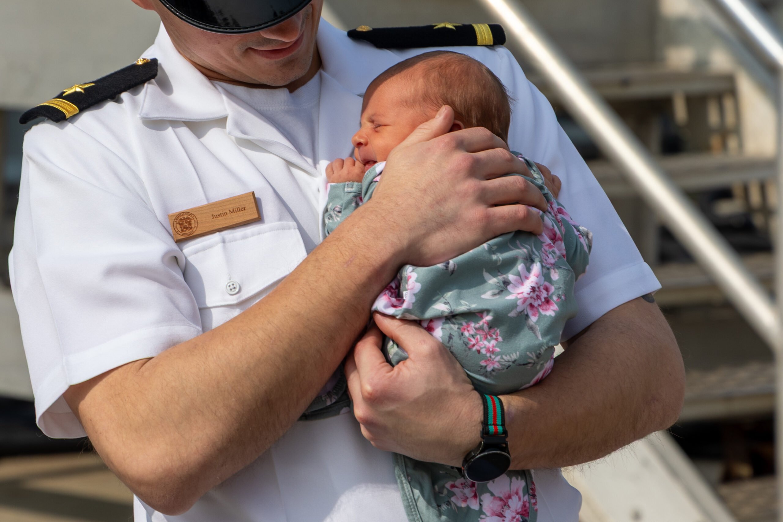 2025年6月1日,被分配到“斯托特”號(DDG-55)上的尉官賈斯汀·米勒首次見到了他尚在襁褓中的孩子。美國海軍學會新聞圖片