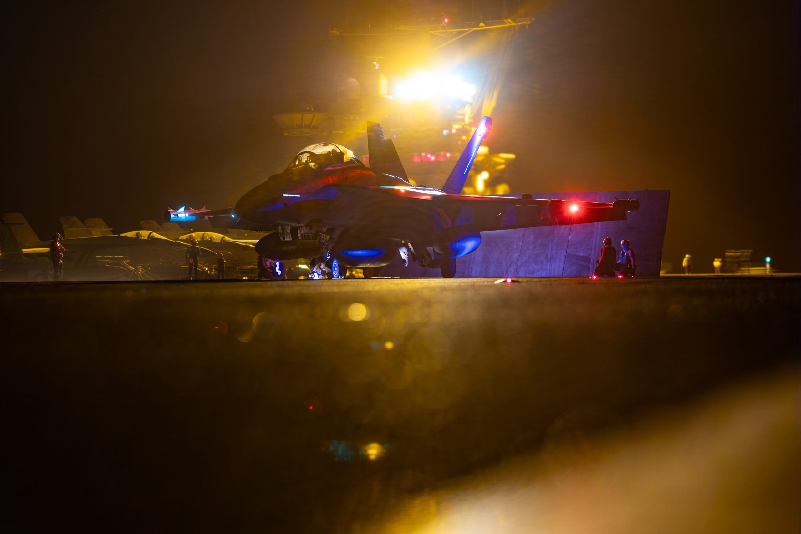 2025年3月18日,隸屬於電子攻擊中隊(VAQ)144的一架E/A-18G“咆哮者”電子戰飛機在“尼米茲”級航空母艦“哈里·S·杜魯門”號(CVN-75)的飛行甲板上準備起飛。美國海軍圖片