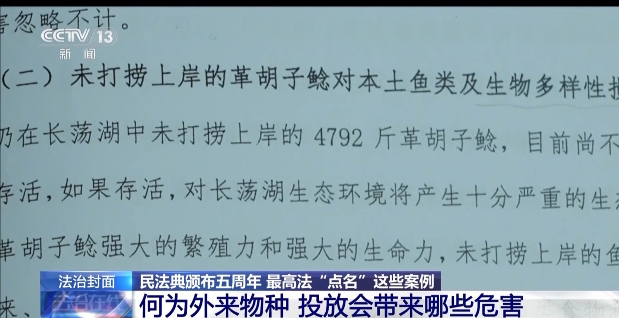 江蘇省南京市人民檢察院檢察官 程曉燕:徐某向長蕩湖一次性投放25000斤外來物種革鬍子鮎的行為,她違反了國家關於增殖放流以及投放外來物種的國家規定。其次她的行為現實中也造成了長蕩湖的生態環境的破壞以及生物安全的風險。所以在這種情況下,我們對她提起了訴訟,訴請追究她生態環境損害的賠償責任以及懲罰性賠償責任。