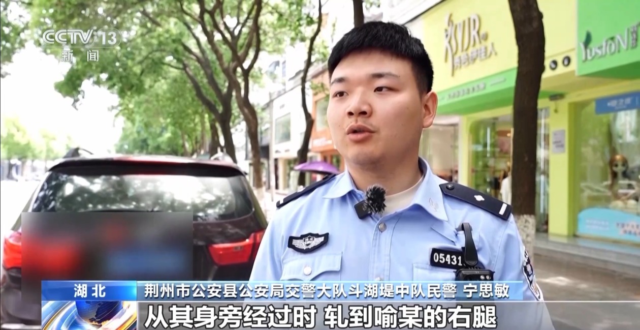 荊州市公安縣公安局交警大隊鬥湖堤中隊民警 寧思敏:當時喻某駕駛電動兩輪摩托車在路邊等人,車上有她的小孩,她雙腿張開、腳撐地,李某駕駛小型越野客車從其身旁經過時,壓到喻某的右腿,造成喻某受傷。