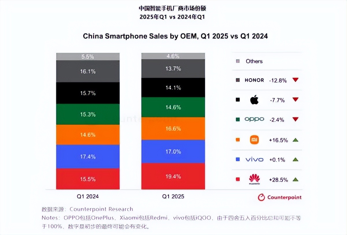 據市場研究機構Counterpoint Research發佈的2025年一季度國內智能手機市場報告顯示,排名前五的依次為:華為(19.4%)、vivo(17.0%)、小米(16.6%)、OPPO(14.6%)、蘋果(14.1%),榮耀以13.7%的份額位列第6名;