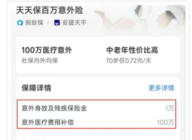 案例二:在螞蟻保平台銷售的天天保百萬意外險(安盛天平),宣稱的“百萬”實為意外醫療費用補償責任,而醫療費用補償是報銷模式,不超過實際醫療費用,所謂的“百萬”為報銷上限,且免賠額高達5千元,而該產品的意外身故及殘疾保額僅有1萬元。