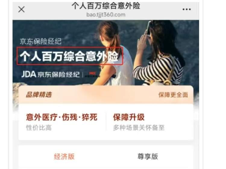 案例一:在京東保險經紀平台銷售的個人百萬綜合意外險(人保財險),宣稱的“百萬”保額僅僅是指航空意外責任,核心的意外身故保險金只有10萬元。
