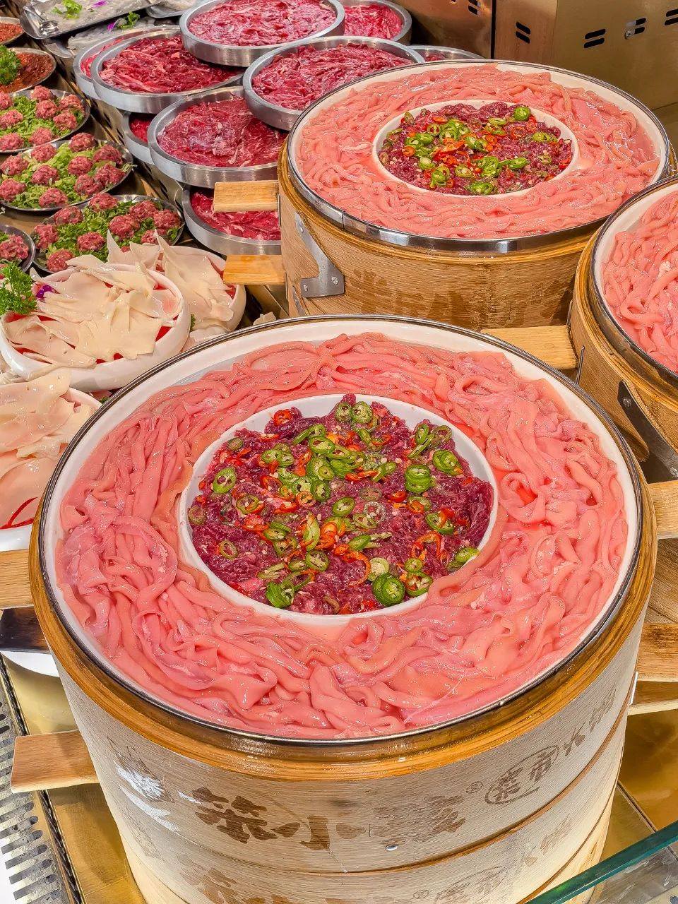 比如,透明檔口裝盤的鮮貨鴨腸、晚7點準時到店現殺牛肉、琳琅滿目的菜品貨櫃,構建出"看得見的鮮度體系"。