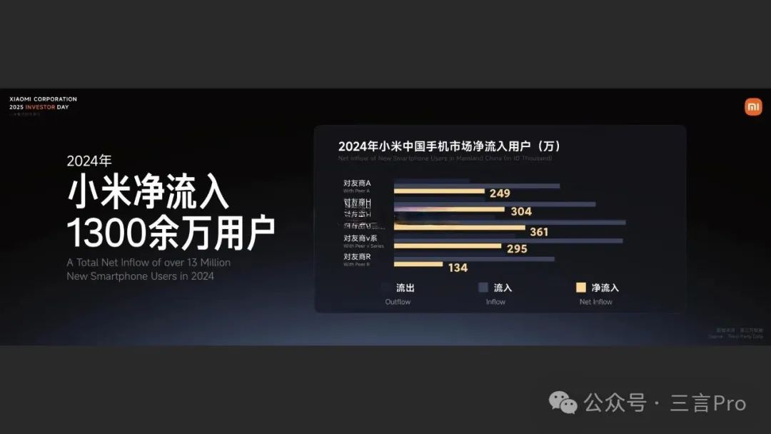 2024年,小米手機淨流入1300餘萬用户,其中蘋果和華為用户達到550萬。盧偉冰強調“沒有規模就沒有競爭力”“能力是原因,業績是結果,變革是抓手”。