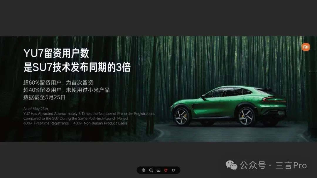 目前,小米YU7熱度非常高。截至5月25日,YU7留資用户數是SU7技術發佈同期的3倍;並且超過60%留資用户為首次留資;超過40%留資用户未使用過小米產品。