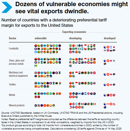 在全球經濟體系中,儘管多邊貿易規則試圖通過特殊和差別待遇條款來扶持脆弱經濟體,但最不發達國家、小島嶼發展中國家和內陸發展中國家在全球經濟中的參與度依然不盡如人意。新的關税緊張局勢,特別是美國可能採取的新關税措施,正對這些經濟體構成新的挑戰。