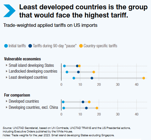 與美國對脆弱經濟體出口徵收的關税相比,脆弱經濟體對美國出口面臨的關税要高得多。數據顯示,脆弱經濟體整體面臨的加權平均關税為29.9%,而最不發達國家更是高達43.9%。