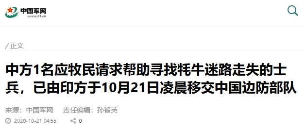 隨後在2020年10月18日,環球時報報道在“拉達克”地區,一名幫助牧民尋找犛牛而迷路走失的中國士兵被印方扣留,隨後按照協議交還給中國邊防部隊。