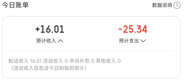 先來看罰款。阿峯( 化名 )同時跑美團和京東的眾包,他向知危展示了自己某天京東外賣的收入:預計收入 16.01 元,預計支出 25.34 元,倒欠了京東 9 元。這些支出,來自超時罰款、取消訂單罰款以及 3 塊錢的保險。
