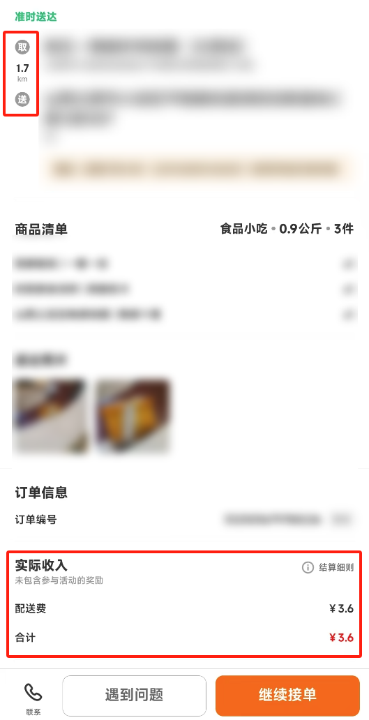 本稿件發送之前,騎手阿峯向知危展示了剛送完的訂單,配送距離 1.7 公里,實收只有 3.6 元。