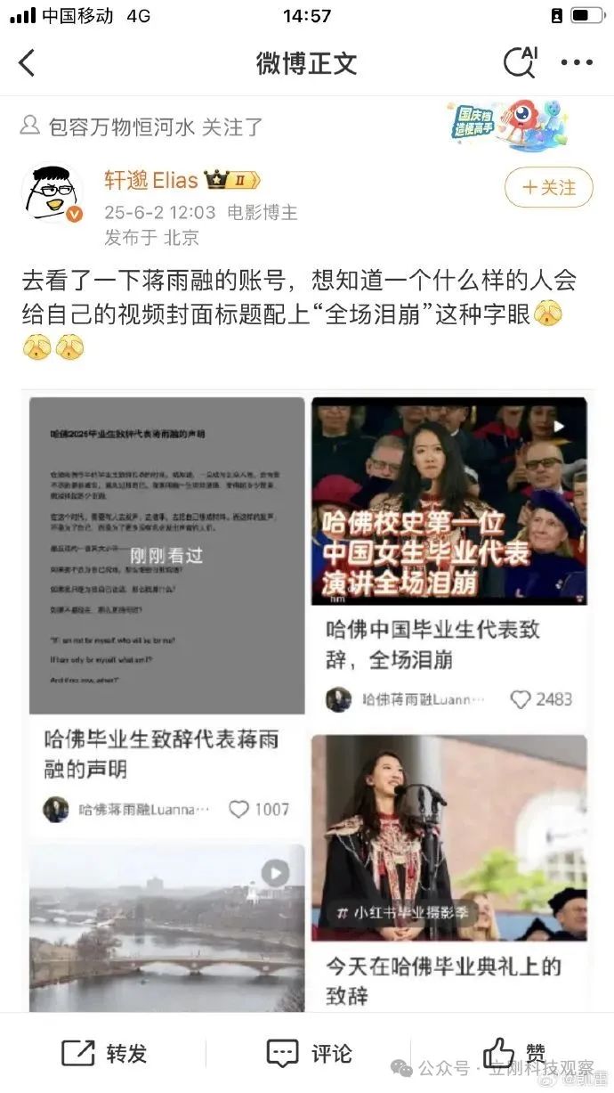 不過這女孩自戀還是挺自戀的,在哈佛畢業做個演講,這不就是大學畢業做個發言?這樣的情況哪一年,不是數百的學生有這經歷,當然也不錯,自己挺高興,家裏挺高興,朋友圈裏説説,也就可以了。她這個是有操作,專門轉到國內來,還有些媒體,包括家鄉的學校都想炒上一把的。她自己的社會平台上就弄了個標題“哈佛校史上第一位女生畢業代表演講全場淚崩”。這個標題就不算太通順,至於她的演講也就是些空泛白左的言論,把這個誇張成全場淚崩,這完全是文科生的想象了。