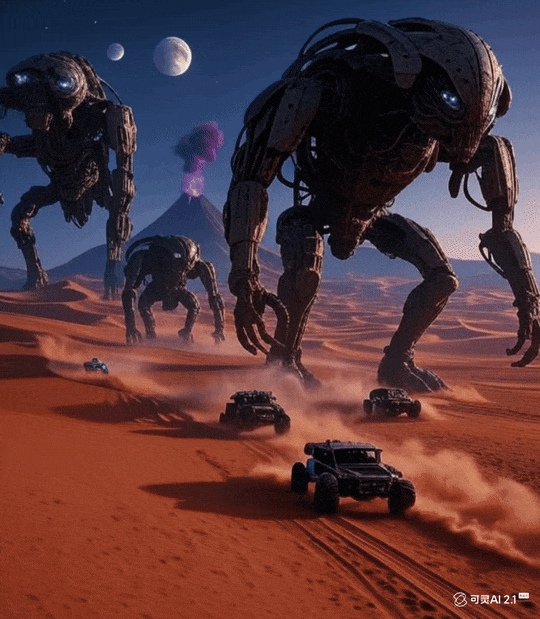 在一片紅色沙漠的外星球上,巨大的機械生物在沙丘間緩慢移動,它們的身體由金屬和有機物混合構成,散發着幽幽藍光。天空佈滿雙月,遠處的火山噴發出紫色煙霧。一支探險隊駕駛懸浮越野車靠近,揚起漫天沙塵。鏡頭從地面視角逐漸拉高,展現機械生物的全貌和壯麗的異星地貌。畫面風格:科幻、荒涼、超現實,史詩感。