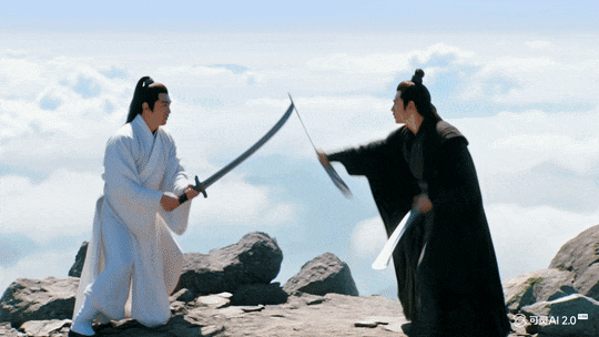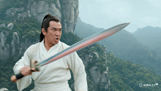很明顯,可靈1.6高品質模式下,涉及多個人物和景色時,在人物細節、動作協調、場景融合以及動態運鏡上的表現就顯得非常差了。畫面的AI感很重,兩位俠客的刀劍都出現了劇烈的形變。