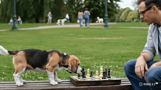 可靈2.1大師模式下的狗狗的皮毛真實感很高,在處理複雜紋理時表現優異,在細節渲染和光影處理上更接近真實。但是,2.1並沒有展現下棋的過程,避開了複雜的物理模擬,這也體現了2.1在語義響應上仍有上升空間: