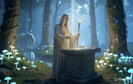 在一片古老的魔法森林中,參天巨樹上纏繞着發光的藤蔓,地面覆蓋着熒光蘑菇。精靈祭司站在石制祭壇前,手持水晶法杖,召喚出漂浮的藍色魔法符文。周圍的空氣中閃爍着微光粒子,遠處的獨角獸在溪流邊飲水。鏡頭環繞祭壇,展現儀式的高潮:一束光柱從天而降,點亮整個森林。畫面風格:夢幻、温暖色調、輕霧瀰漫,電影感,流暢運鏡。