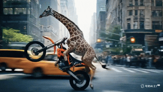 相比之下,同樣的提示詞在可靈2.1大師版下的表現則顯得差了一些。在動態效果的處理上,可靈2.1的畫面流暢度明顯不足,長頸鹿的騎行動作顯得有些怪異,街邊人物的形變很大: