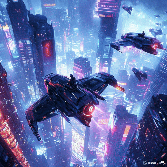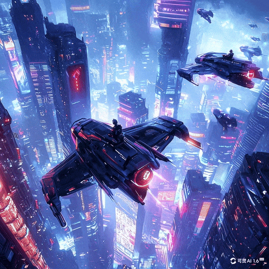 比如,下面這張在霓虹閃爍的摩天大樓間的飛行器的場景: