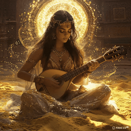 光環旋轉,光屑散落,風吹動沙子、頭髮和衣物,女子在彈動樂器,鏡頭拉遠。