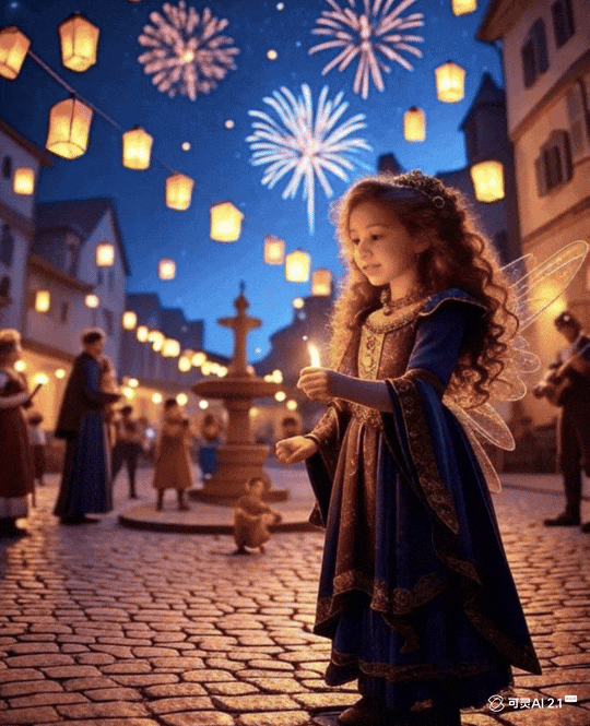 在一個童話風格的小鎮,鵝卵石街道上掛滿彩燈,居民穿着中世紀風格的華麗服裝,參加盛大的節日慶典。孩子們手持氣球,圍着噴泉嬉戲;樂隊演奏歡快的絃樂,煙花在夜空中綻放。鏡頭從小鎮廣場的熱鬧場景推進,聚焦於一位小女孩點亮漂浮燈籠,燈籠緩緩升空,與星空融為一體。畫面風格:温馨、夢幻、色彩豐富,動畫電影風格。