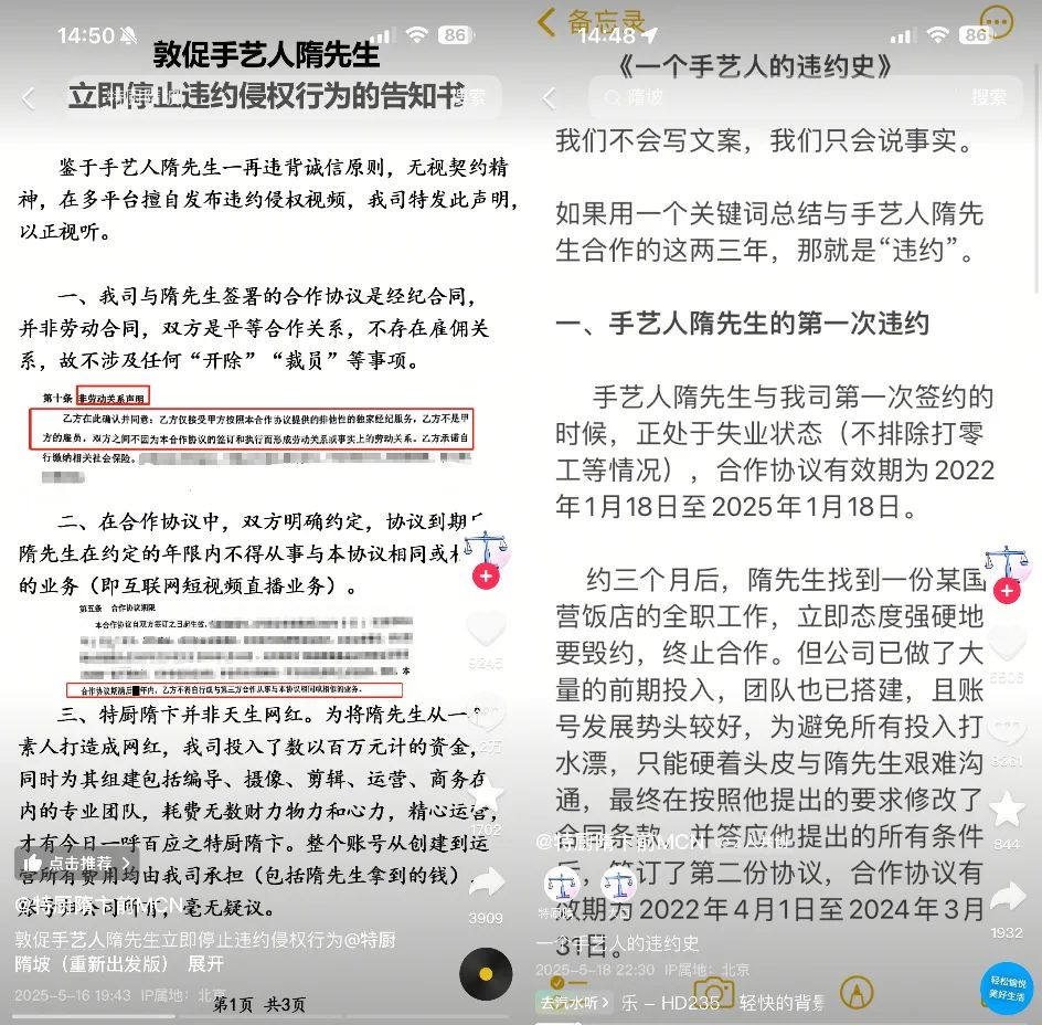 爭議並未結束。5月16日,“@特廚隋卞”賬號發佈視頻《敦促手藝人隋先生立即停止違約侵權行為》,指控隋坡“無視契約精神,在多平台擅自發布違約侵權視頻”。視頻指出,雙方合作協議為經紀合同,約定隋坡在合同到期後的一定期限內不得從事相同或相似業務(即互聯網短視頻及直播)。5月18日,該賬號再發視頻《一個手藝人的違約史》,列舉隋坡合作期間4次違約,包括未完成拍攝任務、與其他公司合作,以及合同期滿後違反競業協議等行為。