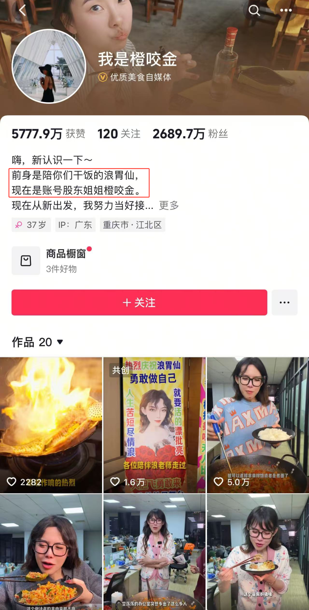 5月26日,擁有2700萬粉絲的網紅“浪胃仙”在停更半年後宣佈迴歸,引發廣泛關注。自稱“廚三代”的“橙咬金”透露,幾個月前,她已簽署價值數百萬元的賬號託管協議,接任“浪胃仙”賬號的新主理人。與此同時,“浪胃仙”也在評論區表示,賬號名稱和頭像將會更改。