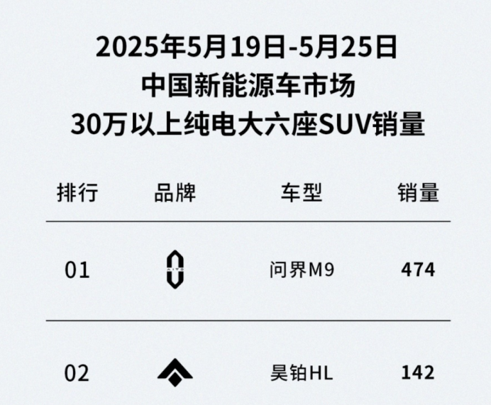 據最新市場數據顯示,昊鉑HL在5月連續四周牢牢佔據30萬以上純電大六座SUV銷量亞軍,僅落後於問界M9。