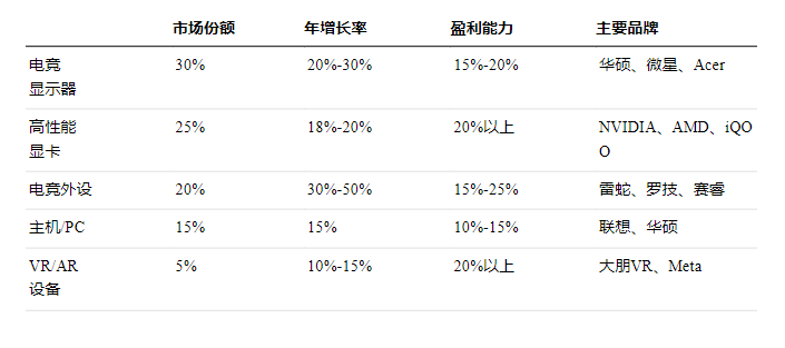 隨着電競成為奧運項目,高性能電腦主機、電競顯示器、機械鍵盤鼠標、智能穿戴設備等細分品類需求激增,盈利模式由單一硬件銷售向品牌授權、賽事服務等多元化方向發展。