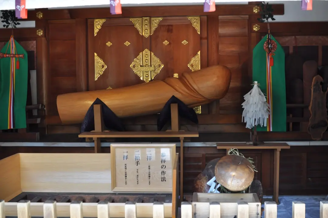 神社內供奉着一根300斤重的木雕巨根,在官網裏介紹道,每年都會使用樹齡200至300年的柏樹,製作一根新的大丁丁木雕。
