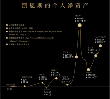 凱恩斯的眼光讓他的個人淨資產從1929年的571萬直線飆升至1936年的4.1億。他管理的劍橋大學國王學院基金的指數從1931年低谷的116飆升至1937年的738,再到1945年的1124。