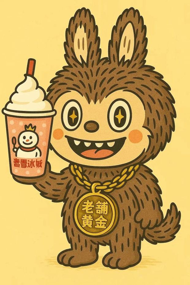 作為典型的工業流水線產物,Labubu 生產成本有限,卻未選擇如蜜雪冰城般的平價親民路線,反而劍指高端,試圖和老鋪黃金一樣走高溢價路線。