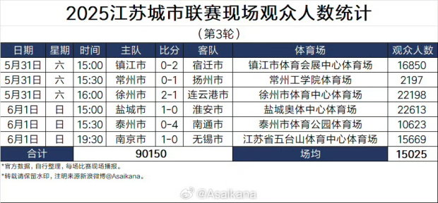 此前江蘇的尷尬在於,省內已無頂級聯賽俱樂部,很多球迷陷入“無隊可看”的尷尬境地,蘇超為他們提供了一個“支持主隊”的窗口。根據德國轉會市場網站中國區管理員@Asaikana 統計,5月31日到6月1日,蘇超6場比賽場均觀賽人數為1.5萬人。