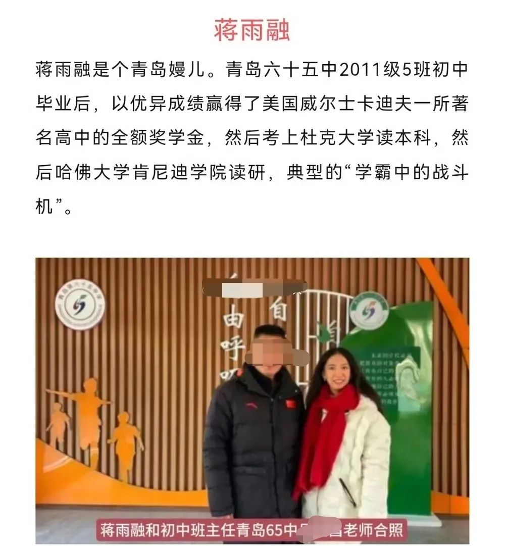 其實最早蔣小姐出來演講的時候,我看國內網友都是誇獎為主,她母校青島65中還專門有篇文章表示很光榮。