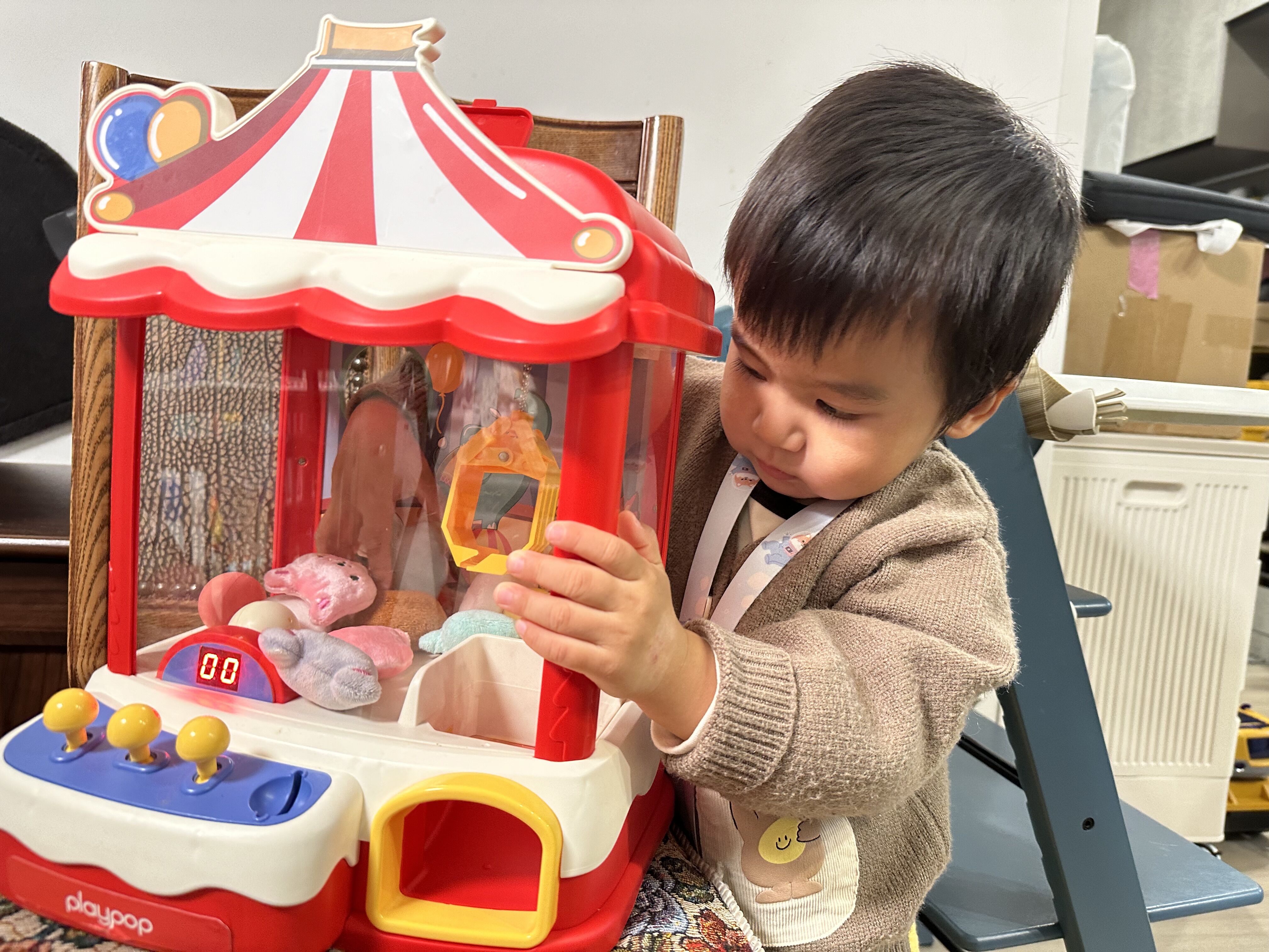 當然還有一些毛絨玩具的變體存在,那就是抓娃娃機。抓娃娃機也是挺有意思的事,帶他在反斗城逛着玩的時候看到抓娃娃機就走不動路了。雖説當時才一歲半話還不會説,但為了要這個抓娃娃機急得都會説話了。但這個抓娃娃機吧雖然外觀很吸引小朋友,但本質是個需要3+才能玩的玩具,對他來説多少算有些超綱。而且抓娃娃機需要三個軸動作有三個操作杆,他那小腦仁顯然處理不了那麼複雜的操作,也因此基本上屬於他瞎玩圖個熱鬧,我們大人玩給他看。不過很快他就發明了自己獨特的玩法,嗯也不是不行吧。