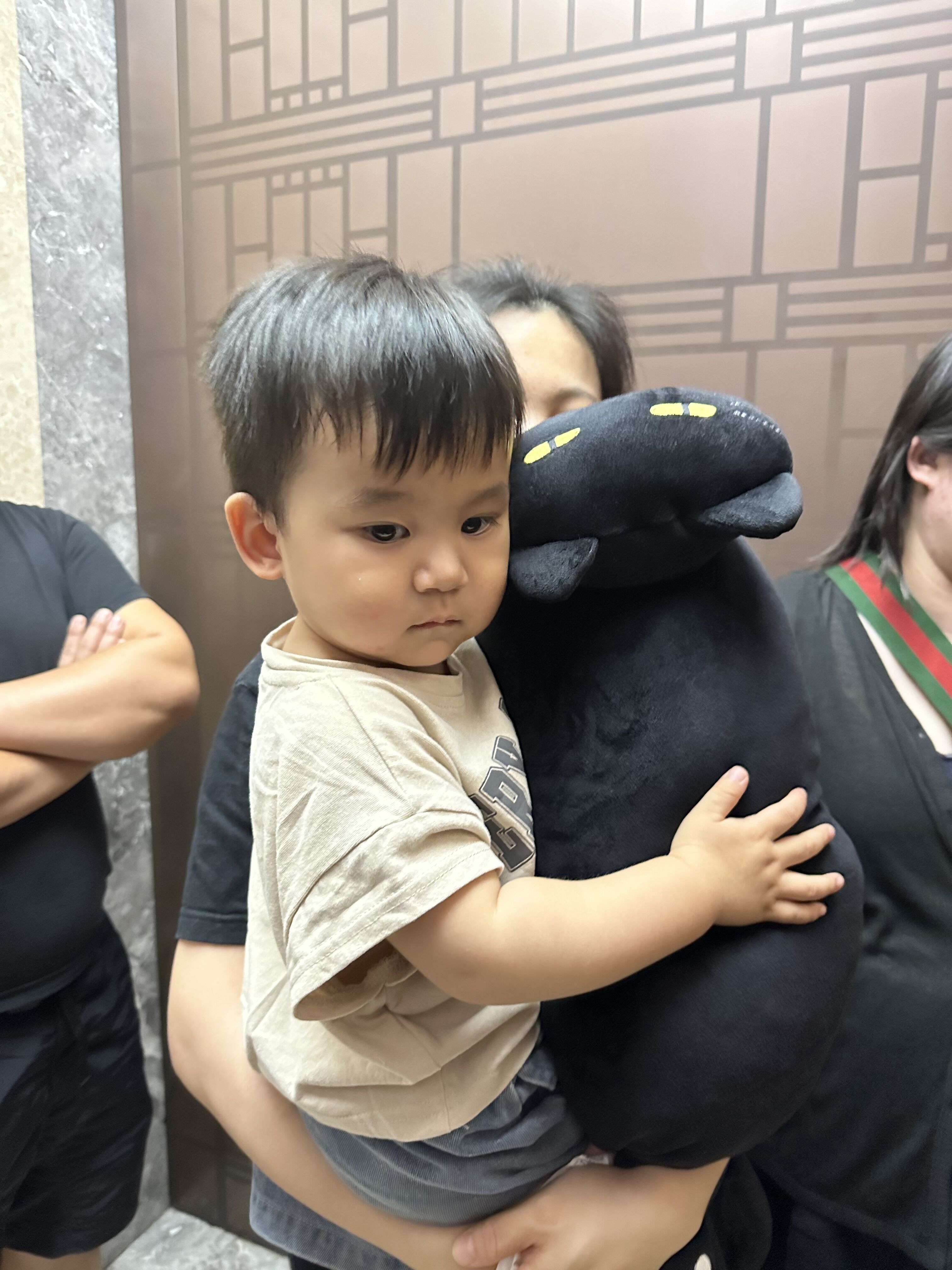 很難説他是喜歡貓還是喜歡毛茸茸的,因為他對毛絨玩具有着超乎尋常的喜愛,比女孩還喜歡。毛絨玩具給他買了很多,但由於會與他密切接觸,所以沒敢買雜牌而是以大牌為主。大部分都是在遛娃時他看到了抱住不撒手買的,別的也有將親媽的毛絨玩具佔為己有。而購買的毛絨玩具主要是這麼幾家:宜德利家居的灰貓黑貓、宜家的鯊鯊,以及親媽的烏薩奇。