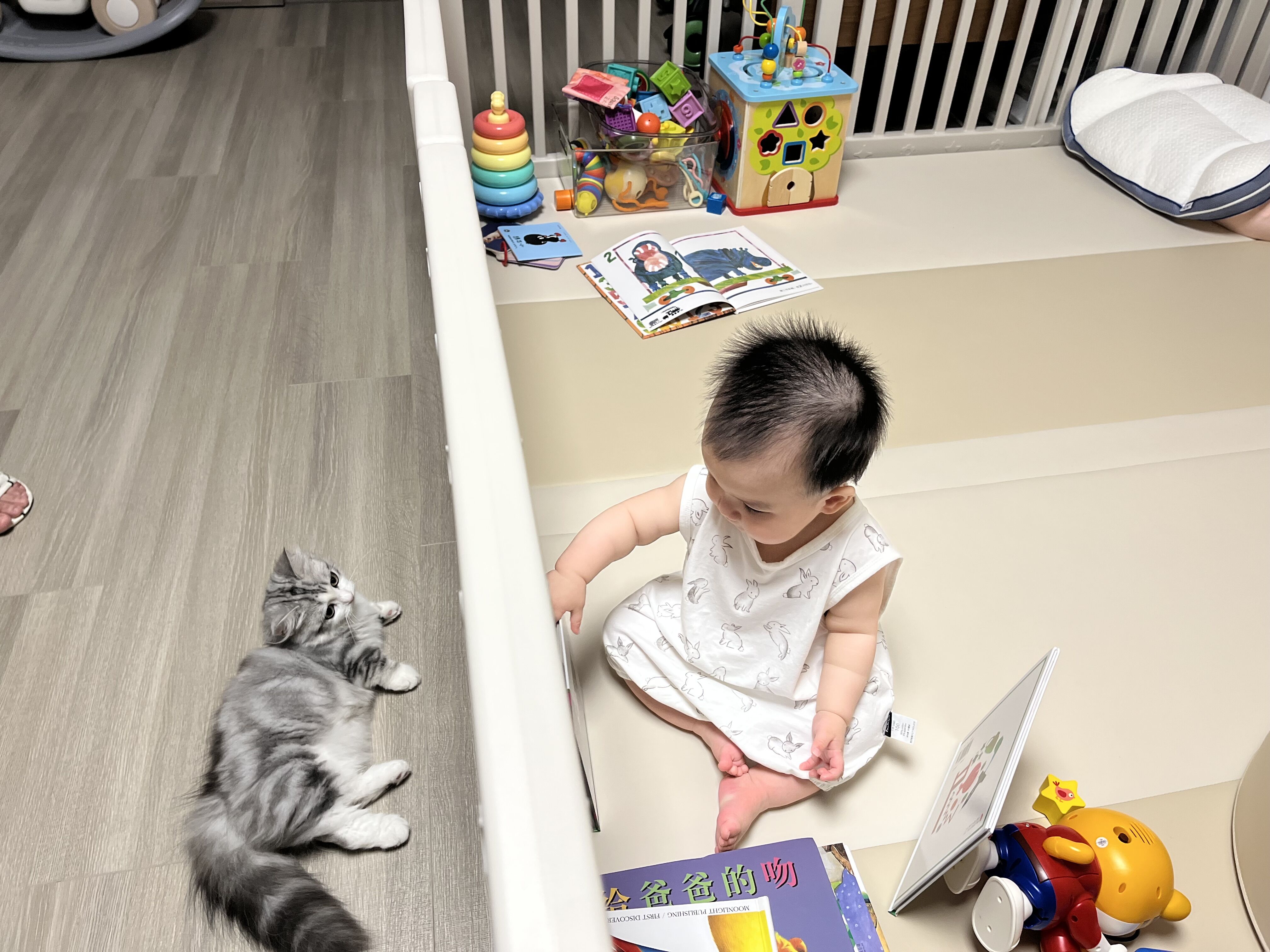 在他六個月的時候精心挑選了一個小貓準備用來陪他玩。而結果也讓我和夫人挺滿意,相當一段時間裏小貓是家裏帶娃意願最高的一個了。打好疫苗做好驅蟲工作後,也不用擔心貓會傳染給孩子寄生蟲,畢竟貓是足不出户。貓對兒子好奇,而嬰兒狀態的兒子也沒足夠的殺傷力,形成了和諧共處。只不過隨着兒子長大並且滿地能跑開始拽貓尾巴,脾氣最好的小貓也開始躲着他了。畢竟帶入一下貓,誰也不喜歡整天被揪尾巴揪毛。有時候貓真被兒子弄煩了,也就扭頭咬一口然後拋開。而兒子呢?揉揉手上的紅印,去玩別的玩具了。