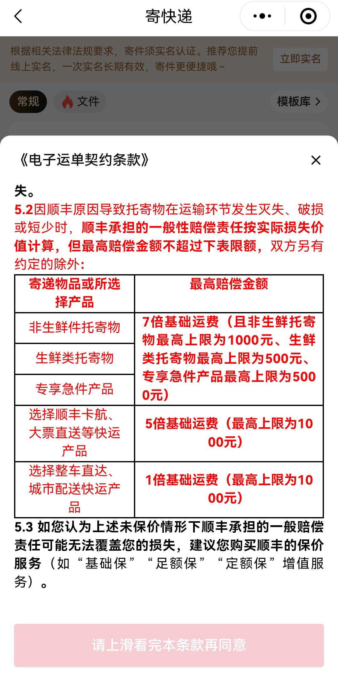“遞運指南”查閲了順豐速運寄件時需勾選的《電子運單契約條款》,條款表明,因順豐原因導致託寄物在運輸環節發生滅失、破損或短少時,順豐承擔的一般性賠償責任按實際損失價值計算,但最高賠償金額不超過以下限額,雙方另有約定的除外:非生鮮件、生鮮類託寄物,以及專享急件產品在未購買保價服務的情況下,最高賠償金額為7倍基礎運費,其中非生鮮託寄物最高上限為1000元,生鮮類託寄物最高上限為500元,專享急件產品最高上限為5000元。