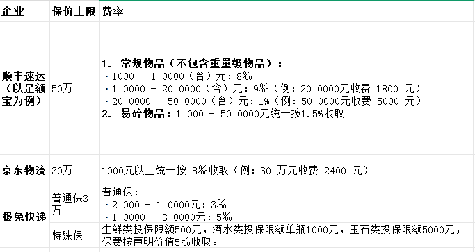 此外,服務範圍存在明顯的“天花板”。順豐、京東保價上限分別為50萬、30萬,極兔則更低,對於珠寶、藝術品、高端電子設備等價值更高的物品來説,快遞行業普遍缺乏標準化的保價方案,企業之間保價服務差異明顯。為了安全,或許可以通過購買單獨保險,但流程繁瑣,成本增加。