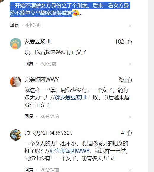 網友評論説:一開始不清楚女方身份立了個刑案,後來一看女方身份不簡單立馬撤案取保道歉。