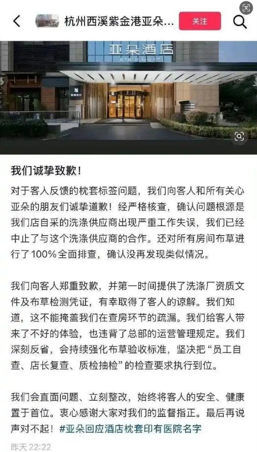 針對“亞朵酒店被曝出現醫院枕套”一事,3日深夜,杭州西溪紫金港亞朵酒店發佈致歉聲明稱,對於客人反饋的枕套標籤問題,酒店向客人和所有關心亞朵的朋友們誠摯道歉。經嚴格核查,確認問題根源是酒店自採的洗滌供應商出現嚴重工作失誤,酒店已經中止了與這個洗滌供應商的合作。酒店還對所有房間布草進行100%全面排查,確認沒再發現類似情況。