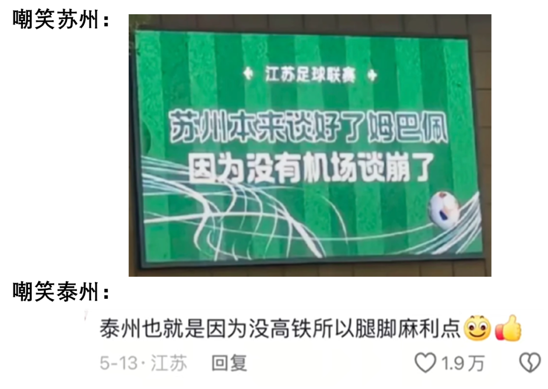 蘇州vs泰州則被網友調侃是沒機場vs沒高鐵。兩地網友吐槽嘴下毫不留情