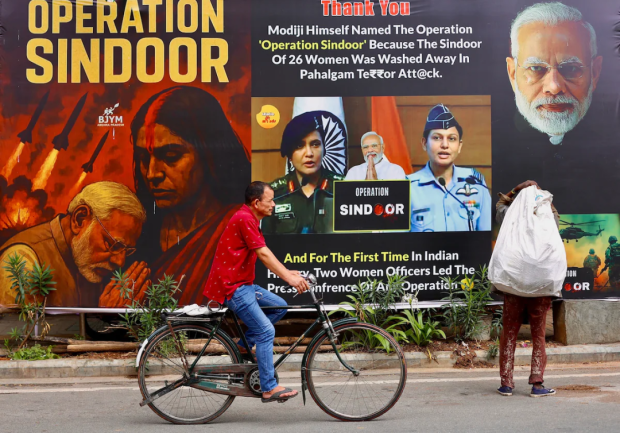 ▲5月21日,在印度班加羅爾,一名男子騎着自行車經過一塊宣傳“辛杜爾行動”的廣告牌。“辛杜爾行動”是印度5月初在巴基斯坦發動軍事行動的代號(圖源:外媒)