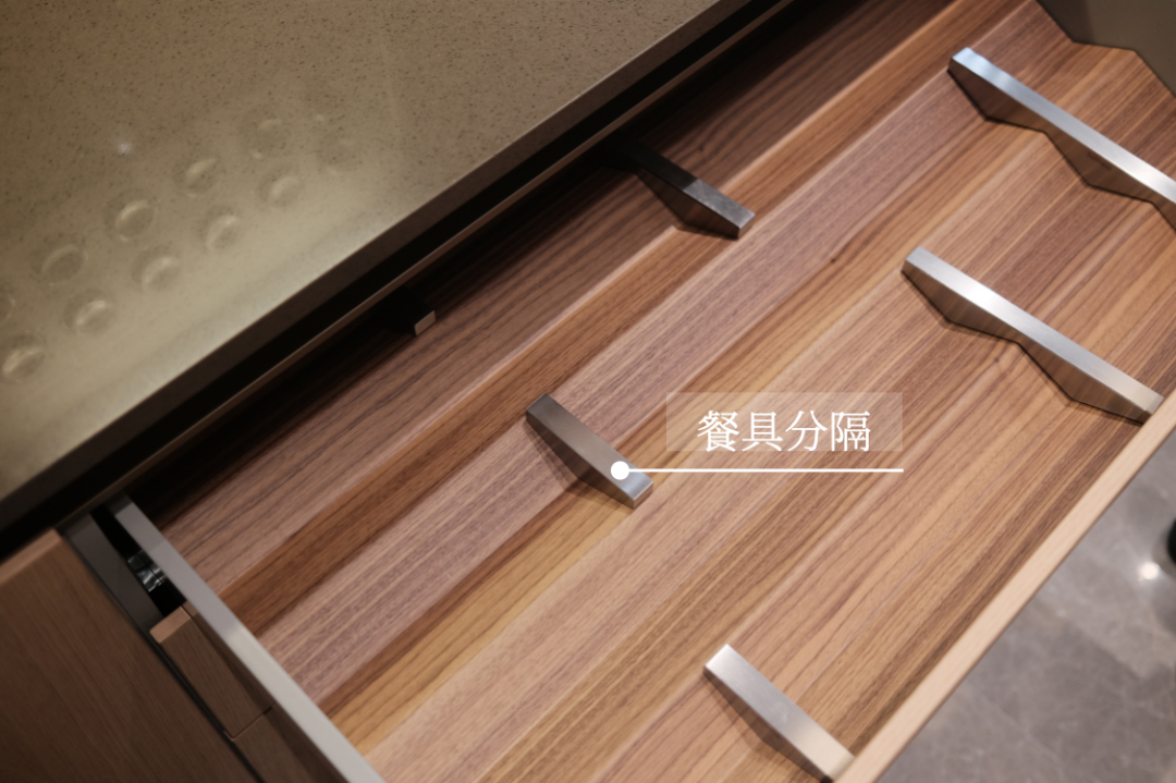 中廚的規劃特別有趣,中廚銜接了家庭廳,然後被放在户型的最深處,成為最安靜的一部分