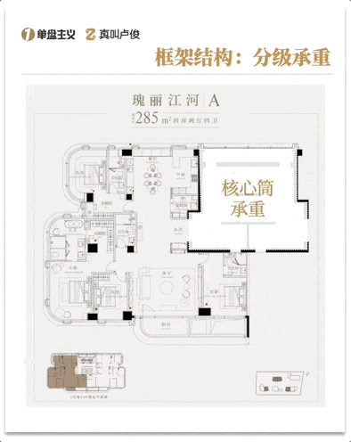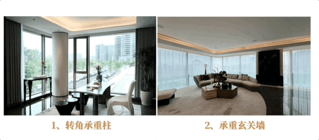 仔細看285平的户型設計,除了幾乎所有承重都集中在核心筒外,户內僅有約8根承重柱,柱體還是向裏內縮