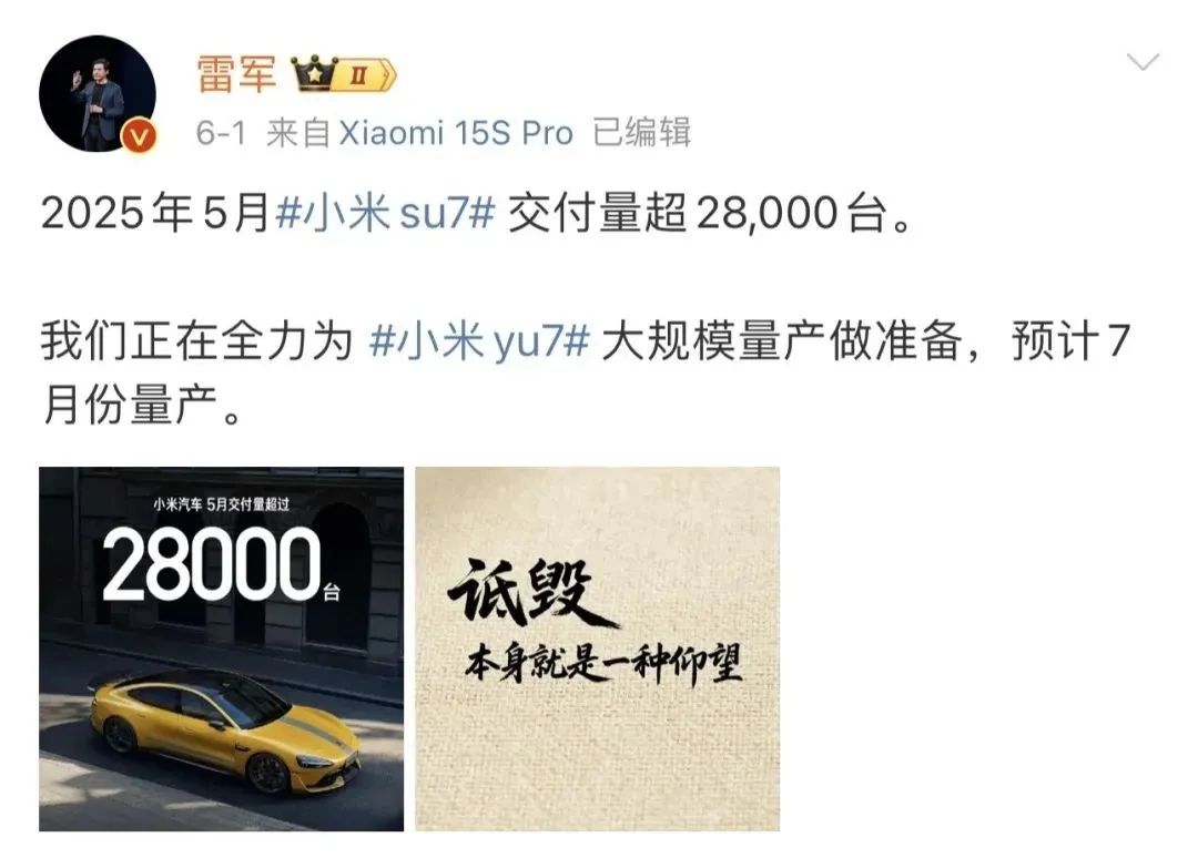 6月1日,雷軍發佈微博稱,我們正在全力為小米YU7大規模量產做準備,預計7月份量產。