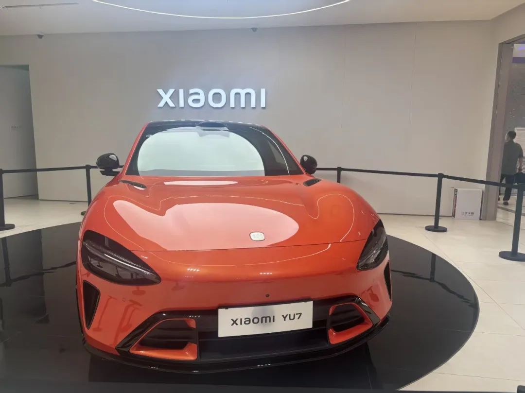 在上海市中心某小米汽車門店內,記者看到小米YU7與SU7並排停放在展廳核心位置。作為小米汽車首款豪華高性能SUV,YU7實車以熔岩橙配色亮相,封閉式前臉搭配橫線弧線設計,機蓋前端的銀色車標在燈光下辨識度極高。