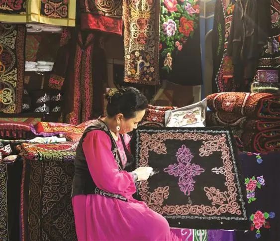在哈薩克人過去傳統的遊牧生活中,刺繡是裝扮日常生活的重要部分,它出現在氈房的各個角落,也出現在人們的服飾上。