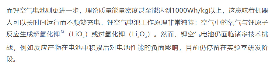 能量密度,即單位質量電池能存儲的能量,決定了機器人能否長時間運行甚至勝任更多複雜任務。近年來,科學家們正積極研究下一代電池技術,比如固態電池、鋰硫電池和鋰空氣電池等。